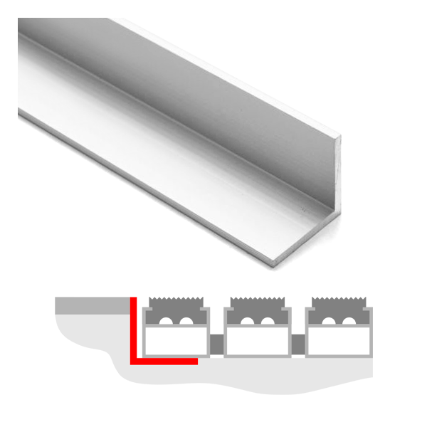 Aluminium-Winkelprofil zur Erstellung von Randrahmen für Einbau-Fußmatten. Abhängig von der zu installierenden Fußmatte in verschiedenen Höhen erhältlich. Lieferung pro Laufmeter Profil.