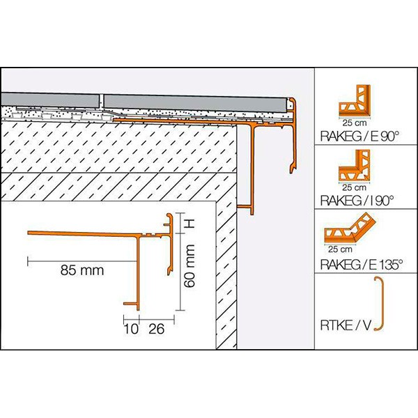 Internal angle 90 ° for BARA-RAKEG. Water pouring profile with dropper for placement on a mortar with slope.