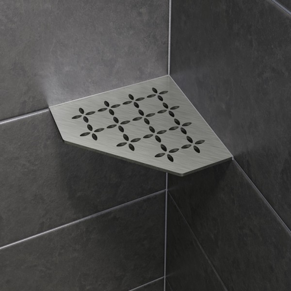 SHELF-E-S2 son estantes en tres geometrías diferentes para su instalación en esquinas. Están disponibles en las variantes de diseño FLORAL y CURVE en acero inoxidable cepillado y en el acabado TRENDLINE de aluminio de alta calidad. Esta repisa de cerámica para baño que se puede integrar en la trama de juntas durante el proceso de colocación de cerámica o se pueden instalar con las alas de sujeción de solo 2 mm de espesor en las juntas de paredes alicatadas existentes. Schlüter-SHELF-E es adecuado para paredes alicatadas con cerámica en duchas y cocinas.