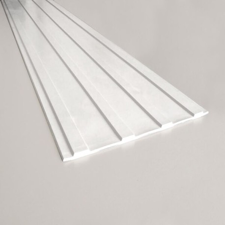 Plaque tactile autocollante en polyuréthane extra-plat de 7 mm de hauteur avec rainures en bas relief. Conçu comme une solution d'avertissement pour identifier les zones d'obstacles. Pour créer un sol podotactile. Pour usage intérieur. Mesure 970 x 228 mm