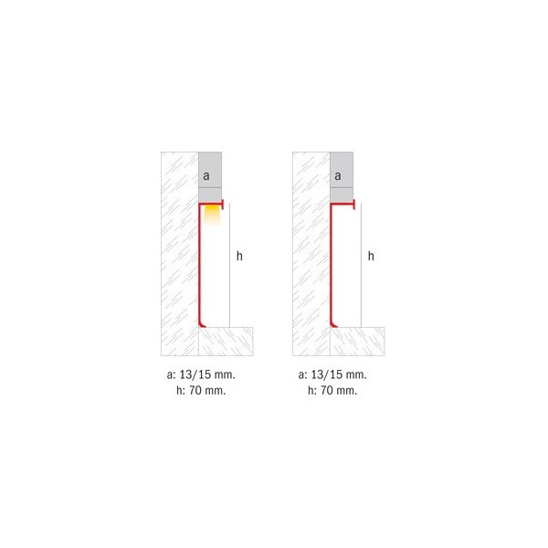 Sa géométrie permet que le bord inférieur de la plaque soit protégé par le profilé et s’installe en faisant un retrait sur la zone inférieure du mur, ce qui offre un effet innovant de mur suspendu. Ses lignes droites, achevées en gorges créent une surface lisse qui empêche l’accumulation de saleté et, facilite le nettoyage. En plus de plinthe, il peut être aussi utilisé comme finition de la partie supérieure du mur.