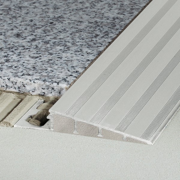 RENO RAMP K são perfis para a união contínua de pavimentos de diferentes alturas, por exemplo, na área de transição de cerâmica para alcatifa. Além disso, protege eficazmente as arestas adjacentes do revestimento. O separador da junta forma uma câmara de junta definida entre o perfil e a cerâmica.
