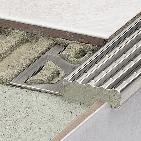 Schlüter TREP-EK é uma variante sem uma asa de trava que deve ser colada ao degrau. Esse perfil é adequado para instalação posterior em etapas com bordas deterioradas para evitar a substituição de ladrilhos danificados.